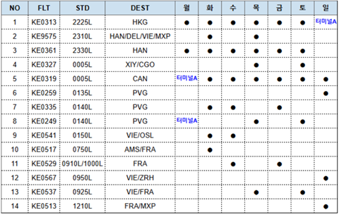 2. 우리 협회는 대한항공으로부터 제2화물터미널 반입 대상편 안내를 요청받아 아래와 같이 안내드리오니 업무에 참고바랍니다.