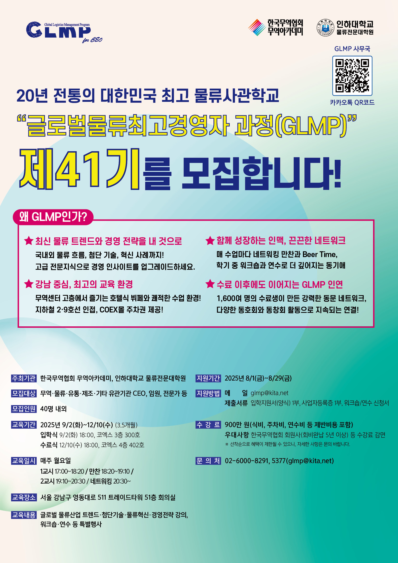 2. 우리 협회는 한국무역협회와 인하대학교가 공동 운영하는 GLMP로부터 글로벌물류 최고경영자 과정(GLMP)