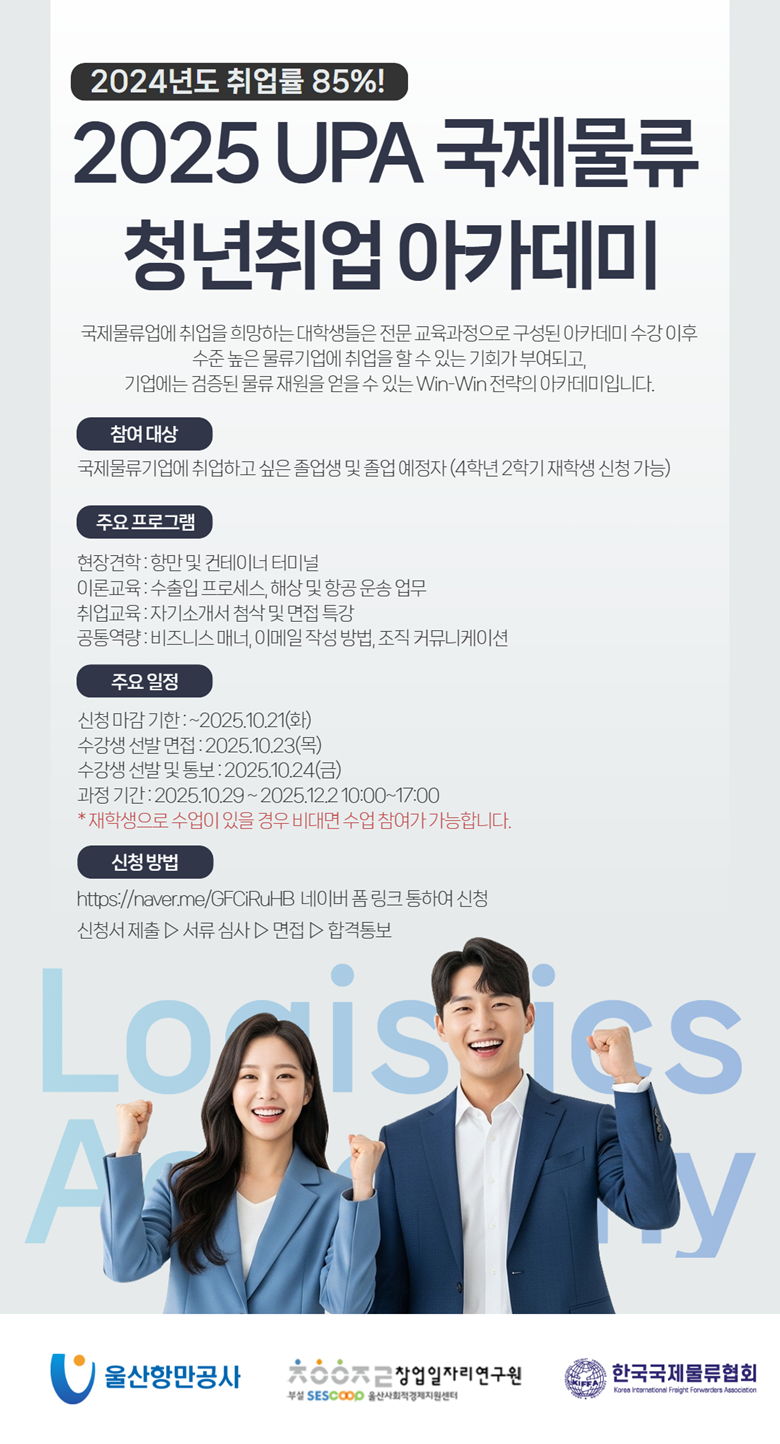 2. 우리 협회는 울산항만공사와 ‘2025 UPA 국제물류 청년취업 아카데미’ 사업을 시작하여 대학 졸업자 및 졸업예정자를 대상으로 국제물류에 대한 전문지식을 함양시켜 우리 국제물류업계에 종사할 수 있도록 하기 위해 청년취업 아카데미를 실시합니다.