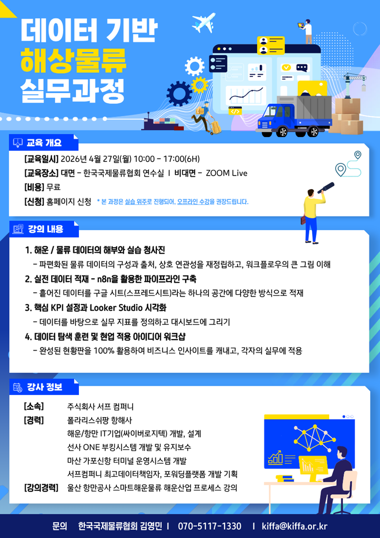 | 교육장 | 대면 : KIFFA 강의실 비대면 : 학습자 한하여 별도 링크 송부 (본 과정은 실습 위주로 진행되어, 오프라인 수강을 권장드립니다.) |