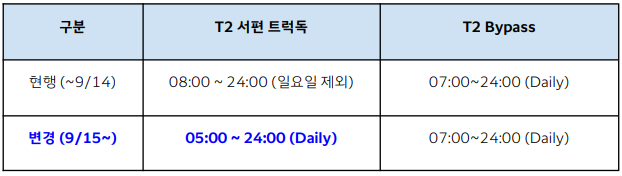 다. 시행 일자 : '25. 9. 15(월) 부. (*9/16 출항편부터 T2로 화물 반입 가능)