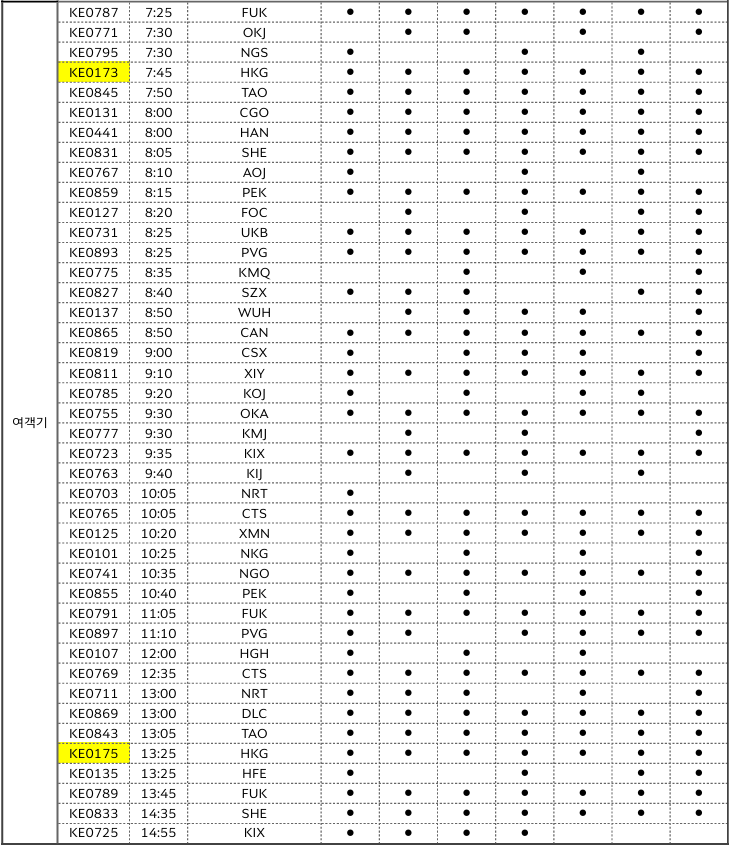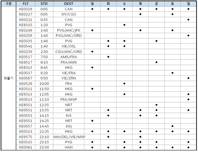 ○화물홈페이지(Cargosvc.koreanair.com) → 터미널공사안내 → 편별 반입터미널 조회